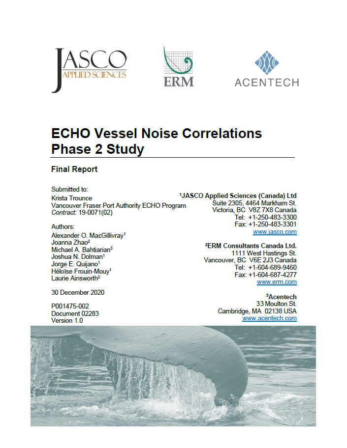 A two-part study for the Vancouver Fraser Port Authority ECHO Program analyzing the statistical correlations between vessel design characteristics and underwater radiated noise levels, to determine design or operational characteristics that may be correlated with louder or quieter sound levels.