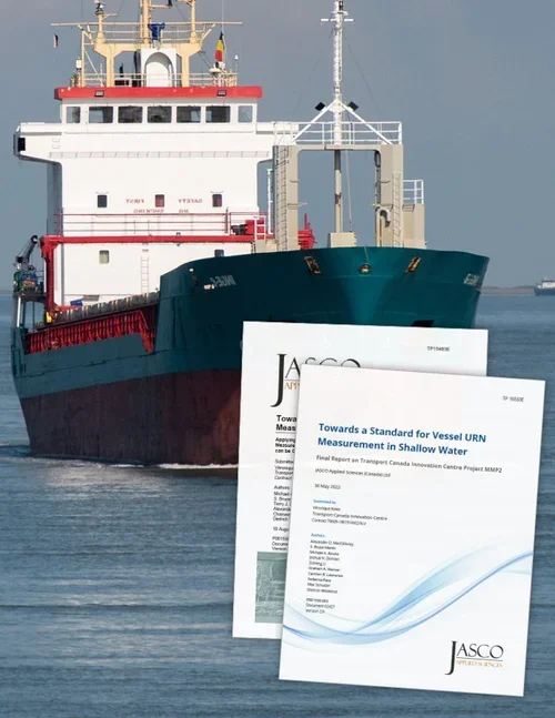 JASCO recorded underwater sound at two locations along a shipping route associated with Baffinland Iron Mine’s Mary River Mine on Baffin Island to measure noise levels from the icebreaker MSV Botnica. Noise was analyzed for 17 one-way transits, including those in open-water and in ice-covered conditions with ice concentrations between 0/10 and 9/10. For each transit, two standard metrics of vessel noise emissions were determined—underwater radiated noise levels and monopole source levels—as well as the distance at which sound levels exceeded the threshold for marine mammal behavioural disturbance from shipping.