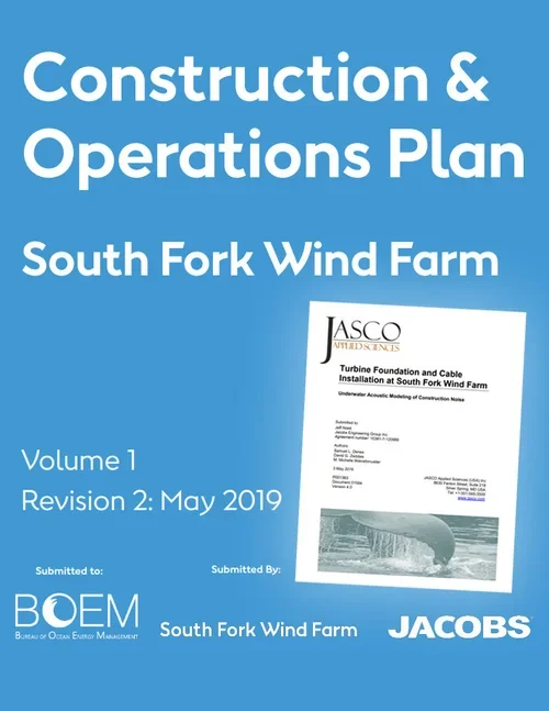 Modelling study of underwater construction noise as part of Deepwater Wind’s Construction and Operations Plan to initiate environmental review of the construction and operation of the South Fork Wind Farm offshore Rhode Island. Acoustic fields were modelled for the sound sources associated with construction of the 15 turbines and export cable, namely impact and vibratory pile driving and thrusters of dynamically-positioned vessels. Ranges to acoustic impact thresholds for cetaceans, sea turtles, and fish were predicted.
