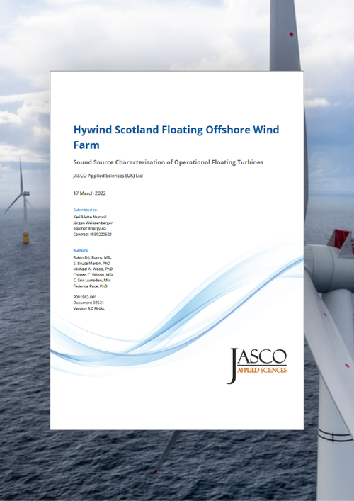 Sound measurements and analysis for the world’s first floating offshore wind farm. Located in the North Sea off the east coast of Scotland, Hywind Scotland comprises five floating wind turbines, each sitting atop a spar buoy that is moored to the seabed. JASCO measured the underwater sound from one turbine for three months using a four-hydrophone tetrahedral array to allow bearing discrimination between sounds from different directions. The sound signature of the turbine was fully characterized, consisting mainly of low-frequency tonal noise associated with rotating rotor and generator components. In addition, the sources of more broadband transient mooring noises were localized.