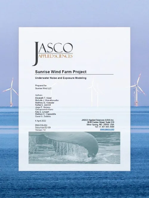 JASCO modelled the potential underwater acoustic impacts resulting from pile driving for installing tapered monopiles, pin piles for jacket foundations, casing pipes, and goal post sheet piles for the construction of the 924 MW Sunrise Wind Farm and associated Export Cable. This underwater noise assessment estimates the number of marine mammals and sea turtles that may experience sound levels that exceed regulatory thresholds and calculates exposure ranges. For fish, ranges to regulatory sound thresholds for injury and behavioral disturbance were calculated.
