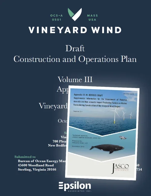 In 2017, JASCO performed an acoustic impact assessment for Vineyard Wind as part of their Construction and Operations Plan submitted to BOEM. In 2018, this supplemental document addressed BOEM’s request for further information on impact producing factors (IPFs) of the Project. JASCO modelled the sound fields from proposed piling activities and estimated the ranges to various sound level isopleths. The sound fields were then combined with JASCO’s JASMINE animal simulation model to estimate potential exposure levels for marine species.
