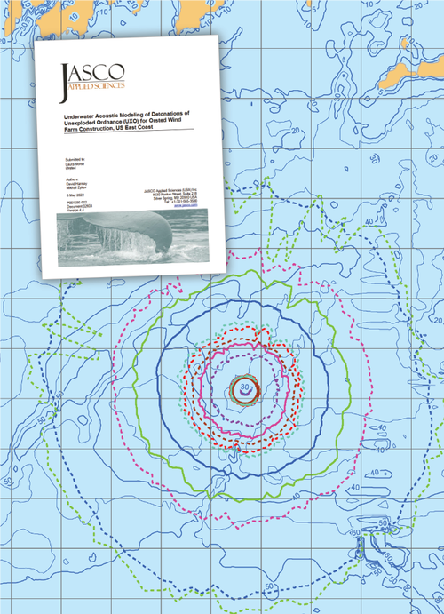 Modelling of acoustic sources and sound propagation to estimate Level-A and Level-B take zones for expected UXO types that may be encountered along export cable routes during wind farm construction. This assessment considers acoustic effects to marine mammals, sea turtles, and fish from five possible charge sizes at sites with four water depths near Ørsted’s Revolution Wind project areas. The results are also relevant for sites with similar water depths at Ørsted’s Ocean Wind 1 project, Ørsted’s Sunrise Wind project, and possibly other wind farm sites with similar properties.